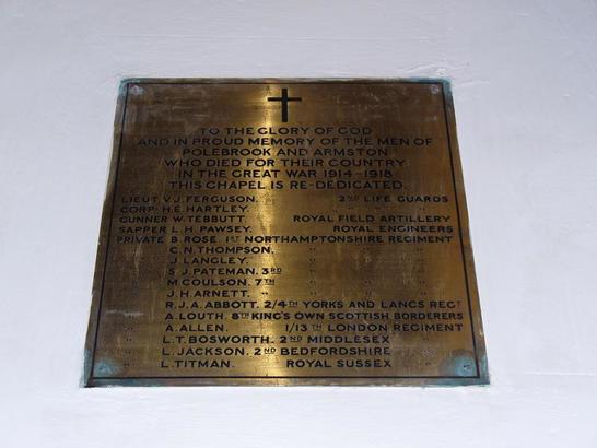 + / TO THE GLORY OF GOD / AND IN PROUD MEMORY OF THE MEN OF / POLEBROOK AND ARMSTON / WHO DIED FOR THEIR COUNTRY / IN THE GREAT WAR 1914 -1918 / THIS CHAPEL IS RE-DEDICATED. / (16 names)