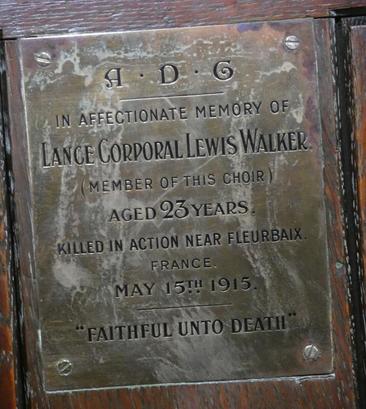 A. D. G./ IN AFFECTIONATE MEMORY OF/ LANCE CORPORAL LEWIS WALKER./ (MEMBER OF THIS CHOIR)/ AGED 23 YEARS/ KILLED IN ACTION NEAR FLEURBAIX, FRANCE./ MAY 15TH. 1915./ "FAITHFUL UNTO DEATH"