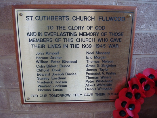 ST. CUTHBERT'S CHURCH FULWOOD/ TO THE GLORY OF GOD/ AND IN EVERLASTING MEMORY OF THOSE/ MEMBERS OF THIS CHURCH WHO GAVE/ THEIR LIVES IN THE 1939 - 1945 WAR/ (Names)/ FOR OUR TOMORROW THEY GAVE THEIR TODAY