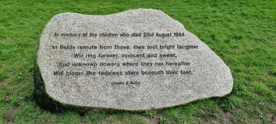 In memory of the children who died 23rd August 1944/ In fields remote from these, their lost bright laughter / Will ring forever, innocent and sweet, / and unknown flowers where they rune hereafter / Will bloom again like fadeless stars beneath their feet / Charles E Butler