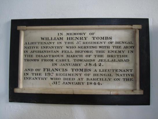 IN MEMORY OF/ WILLIAM HENRY TOMBS/ A LIEUTENANT IN THE 5TH REGIMANT OF BENGAL/ NATIVE INFANTRY WHO SERVING WITH THE ARMY/ IN AFGHANISTAN FELL BEFORE THE ENEMY IN/ THE DISASTROUS MARCH OF THE BRITISH/ TROOPS FROM CABUL TOWARDS JELLALABAD/ IN JANUARY 1842. AND OF FRANCIS TOMBS A LIEUTENANT / IN THE 19TH REGIMENT OF BENGAL NATIVE / INFANTRY WHO DIED AT BARCILLY ON THE / 31ST JANUARY 1844.