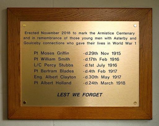 Erected November 2018 to mark the Armistice Centenary/ and in remembrance of those young men with Asterby and/ Goulceby connections who gave their lives in World War 1/ (names)/ LEST WE FORGET