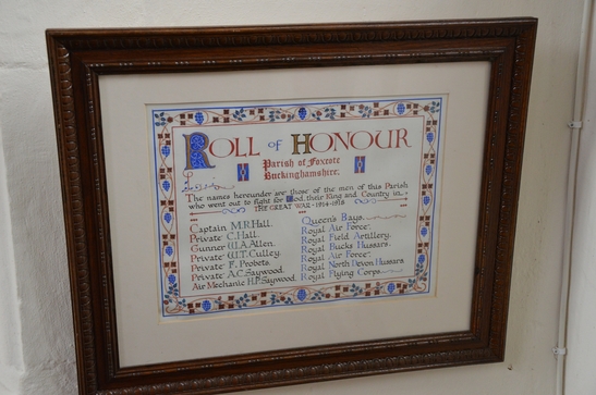 ROLL OF HONOUR / PARISH OF FOXCOTE / BUCKINGHAMSHIRE / THE NAMES HEREUNDER ARE THOSE OF THE MEN OF THIS PARISH / WHO WENT OUT TO FIGHT FOR GOD THEIR KING AND COUNTRY IN / THE GREAT WAR 1914-1918