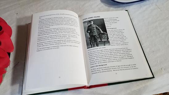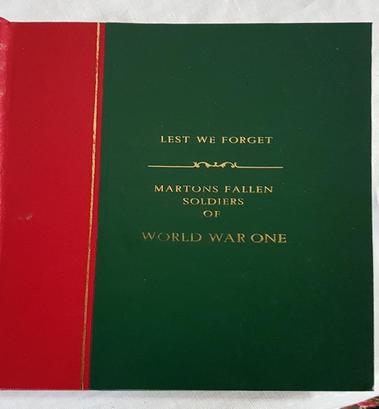 THE ORIGINAL IDEA FOR THIS BOOK CAME FROM ANN GREGORY'S/ RESEARCH INTO THE WORLD WAR ONE SERVICE RECORDS OF HER/ DEAR UNCLE, WHO LOST HIS LIFE IN THAT CONFLICT./ HE WAS PRIVATE STANLEY HOLT No. 1187 OF THE ROYAL/ WARWICKSHIRE REGIMENT, 15th BATTALION (AFFECTIONATELY/ KNOWN AS THE "BIRMINGHAM PALS"). HE WAS KILLED IN ACTION ON/ 6th JUNE 1916 AGED ONLY 17 YEARS. HIS NAME IS INSCRIBED ON THE/ ARRAS MEMORIAL IN FRANCE. STANLEY HAS NO KNOWN GRAVE./ THIS KNOWLEDGE INSPIRED ANN, WHO IS A RESIDENT OF MARTON,/ TO RESEARCH THE LIFE STORIES OF MARTON'S FALLEN SOLDIERS/ WHOSE BRAVERY AND COURAGE HAS NEVER BEEN RECORDED./ BECAUSE OF THIS HISTORIC ARCHIVE, MUCH OF MARTON'S EARLY LIFE/ HAS BEEN UNEARTHED, AND MADE PUBLIC FOR THE FIRST TIME.