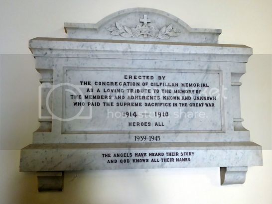 ERECTED BY/THE CONGREGATION OF GILFILLAN MEMORIAL/AS A LOVING TRIBUTE TO THE MEMORY OF/THE MEMBERS AND ADHERENTS KNOWN AND UNKNOWN/WHO PAID THE SUPREME SACRIFICE IN THE GREAT WAR/1914-1918/HEROES ALL/1939-1945/THE ANGELS HAVE HEARD THEIR STORY/AND GOD KNOWS ALL THEIR NAMES