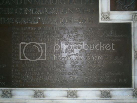 Column 1- Pte. Robert S. Abernethy, Canadian M.G.C./ Capt. Arthur Begg, Lincoln Regiment/ Pte. Alexander M. Black, R.A.S.C./ Major Allan Black, Royal Engineers/ Capt. Aitken Brown, The Black Watch R.H./ Pte. William M. Burry, London Regiment/ Pte. James N. C. Cameron, Canadian M.G.C./ Trooper Charles S. Davie, Royal Scots Greys/ Sub-Lieut. David Esplin, Royal Naval Reserve/ Pte. John H. Geddes, Seaforth Highlanders/ M I. Sergt. Morgan Gibson, Fife & Forfar Yeomanry/ Pte. Charles H. Harrington, Royal Engineers/ Pte. Robert Isles, Scots Guards/ 2nd Lieut. James Kerr, Highland Light Infantry/ Trooper Peter Lawson, The Scottish Horse; Column 2- Pte. David H. Leighton, Scots Guards/ 2nd Lieut. Alexander S. Low, Scottish Rifles/ Pte. Jack MacDonald, Argyll & Sutherland Highlanders/ A.B. David MacDougall, Royal Naval Division/ Pte. Tom McBurney, Machine Gun Corps/ Pte. Alfred J. McGill, London Regiment/ Pte. James McIntosh Jun., The Royal Scots/ Pte. Robert Pearson, Gordon Highlanders/ Sergt. Alexander Potter, The Black Watch R.H./ Sergt. James M,. Rattray, Fife and Forfar Yeomanry/ A.B. Robert J. Rattray, Naval Brigade/ Pte. Charles S. Shand/ L/Cpl. Andrew K. G. Simpson, Gordon Highlanders/ Pte. John Smith, The Black Watch R.H./ Capt. Talbert Stevenson, M.C., The Black Watch R.H./ Gunner David Whitton, Royal Field Artillery