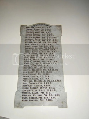 Two white marble tablets. The first is for the 29 men from All Saints Mission, and names A to D from Holy Trinity Mission, the second names E onwards from Holy Trinity Mission. All Saints Mission existed from 1908 to 1944 and Holy Trinity Mission from 1881 to 1944 according to information from the National Archives of Scotland. There is no evidence that these tablets were ever in either of the Mission Churches. There is a small brass plaque below detailing the relocation.
