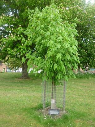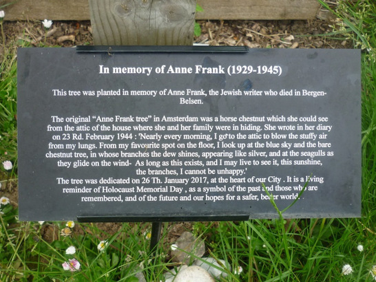 Original Plaque ANNE FRANK'S TREE/ Planted on 12 June 1998/ To commemorate Anne Frank/ and all the children killed in/ wars and conflicts in this century/ Planted by/ The Mayor of the City of Derby/ Councillor Abdul Rehman; Current Plaque In memory of Anne Frank (1929-1945) // This tree was planted in memory of Anne Frank, the Jewish writer who died in Bergen-Belsen. // The original "Anne Frank tree" in Amsterdam was a horse chestnut which she could see from the attic of the house where she and her family were in hiding. She wrote in her diary on 23 Rd. February 1944 : 'Nearly every morning, I go to the attic to blow the stuffy air from my lungs. From my favourite spot on the floor, I look up at the blue sky and bare chestnut tree, in whose branches the dew shines, appearing like silver, and at the seagulls as they glide on the wind- As long as this exists, and I may live to see it, this sunshine, the branches, I cannot be unhappy.' // The tree was dedicated on 26 Th. January 2017, at the heart of our City. It is a living reminder of Holocaust Memorial Day, as a symbol of the past and those who are remembered, and of the future and our hopes for a safer, better world.