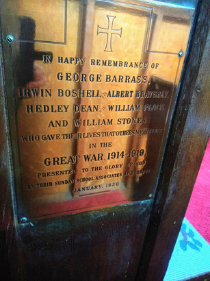 IN HAPPY REMEMBRANCE OF/ (Names)/ WHO GAVE THEIR LIVES THAT OTHERS MIGHT LIVE/ IN THE/ GREAT WAR 914 - 1919/ PRESENTED TO THE GLORY OF GOD/ BY THEIR SUNDAY SCHOOL ASSOCIATES AT BEESTON/ JANUARY, 1920