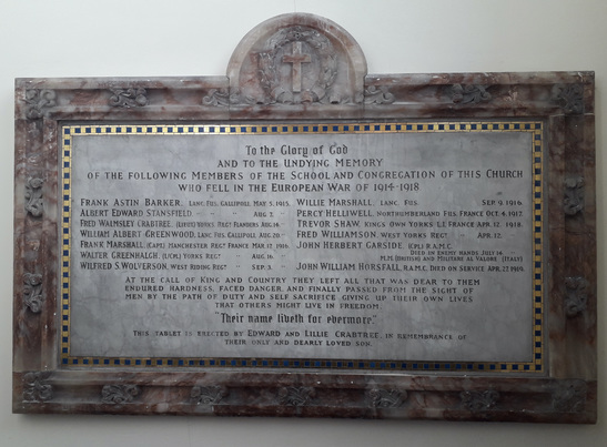 To the glory of God and to the undying memory of the following members of the School and Congregation of this Church who fell in the European War of 1914 -1918 At the call of King and Country they left all that was dear to them endured hardness. Faced danger and finally passed from the sight of men by the path of duty and self sacrifice giving up their own lives that others might live in freedom. "Their name liveth for evermore" This tablet is erected by Edward and Lillie Crabtree. In remembrance of their only and dearly loved son.