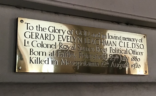To the Glory of God and in loving memory of GERARD EVELYN LEACHMAN CIE DSO Lt Col Royal Sussex Regt Political Officer Born at Fairley Petersfield 27th July 1880 Killed in Mesopotamia 12th August 1920