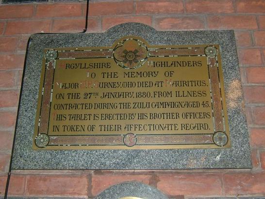 Argyllshire Highlanders /To the Memory of /Major W. P. Gurney, who died at Mauritius /On the 27th January 1880, from illness /Contracted during the Zulu Campaign: Aged 45 /This Tablet is erected by his Brother Officers /In token of their affectionate regard