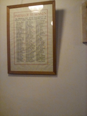 PARISH OF ST SENNEN/The following men served their Country, as/Sailors & Soldiers during the Great War 1914-1918/[names in 3 columns]