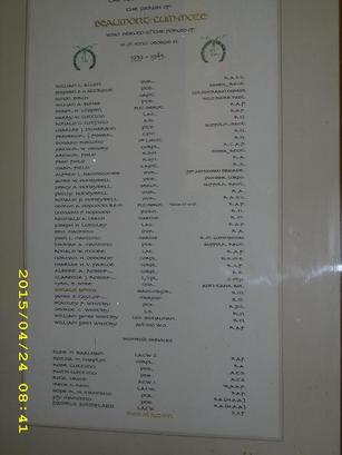 [top line missing]...……...THE PARISH OF/BEAUMONT-CUM-MOZE/WHO SERVED IN THE FORCES OF/H.M. KING GEORGE VI/1939-1945/[names]/WOMEN'S SERVICES/[names]/DIED IN ACTION