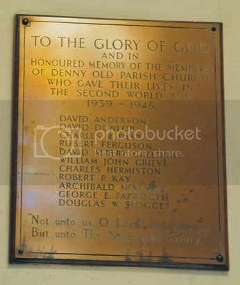 TO THE GLORY OF GOD/AND IN/HONOURED MEMORY OF THE MEMBERS/OF DENNY OLD PARISH CHURCH/WHO GAVE THEIR LIVES IN THE SECOND WORLD WAR/1939-1945/[names]/"Not unto us o Lord,.../But unto Thy Name give Glory"