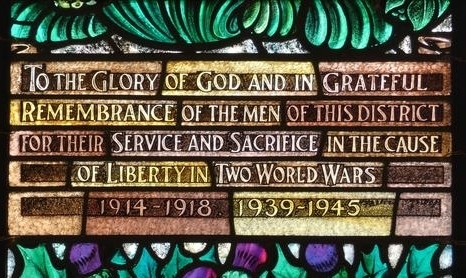 TO THE GLORY OF GOD AND IN GRATEFUL/REMEMBRANCE OF THE MEN OF THIS DISTRICT/FOR THEIR SERVICE AND SACRIFICE IN THE CAUSE/OF LIBERTY IN TWO WORLD WARS/1914-1918 1939-1945