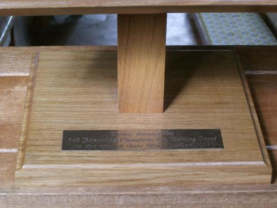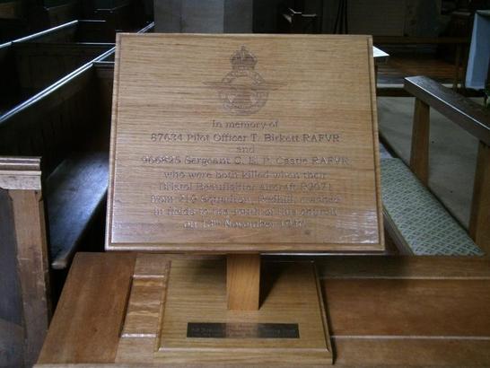 On slope: In memory of / 87634 Pilot Officer T. Birkett RAFVR / and / 966825 Sergeant C. E. P. Castle RAFVR / who were both killed when their / Bristol Beaufighter aircraft R2071 / from 219 Squadron, Redhill, crashed / in fields to the south of this church / on 13th November 1940.; On base: Plaque donated by / 340 [Edenbridge] Squadron Air Training Corps / in the year of their Silver Jubilee 2014