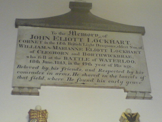 To the Memory of/JOHN ELLIOTT LOCKHART/CORNET in the 12th British Light Dragoons, eldest Son of/WILLIAM & MARIANNE ELLIOTT LOCKHART/of CLEGHORN and BORTHWICKBRAE/who fell at the BATTLE of WATERLOO,/18th June 1815, in the 19th year of his age./Beloved by his friends, and Respected by his/comrades in arms. He shared in the laurels of/that field, where He found his early grave.