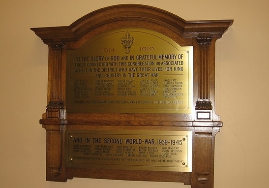 1914 1918/TO THE GLORY OF GOD AND IN GRATEFUL MEMORY/OF THOSE CONNECTED WITH THIS CONGREGATION OR ASSOCIATED/WITH THE DISTRICT WHO GAVE THEIR LIVES FOR KING/AND COUNTRY IN THE GREAT WAR/[names in 5 columns]/"GREATER LOVE HATH NO MAN THAN THIS THAT A MAN LAY DOWN HIS LIFE FOR HIS FRIENDS"//AND IN THE SECOND WORLD-WAR 1939-1945/[names in 5 columns]/"AT THE GOING SOWN OF THE SUN AND IN THE MORNING WE WILL REMEMBER THEM"