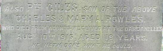 .../ Also Pte. Giles, son of the above/ Charles & Mary A Rowles./ Who Died from Wounds Received at the Dardanelles/ Augt. 19th 1915, Aged 19 years./ He hath done what he could.