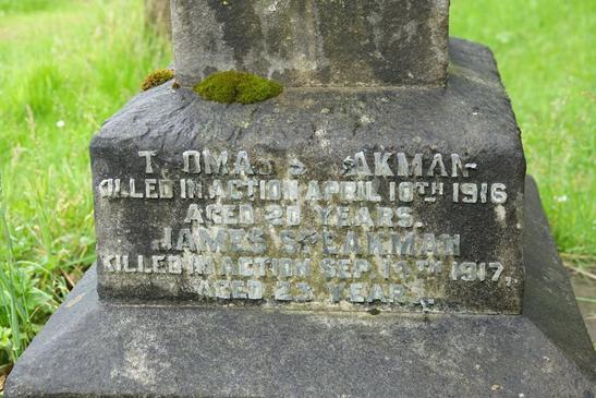 Thomas Speakman/ Killed in Action April 10th 1916/ Aged 20 years./ James Speakman/ Killed in Action Sep. 14th 1917, Aged 23 years.