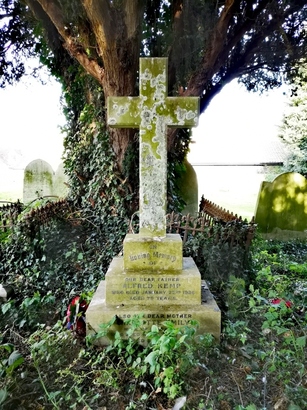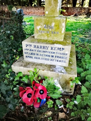 IN / LOVING MEMORY / OF / OUR DEAR FATHER / ALFRED KEMP / WHO DIED JANUARY 22ND 1936 / AGED 79 YEARS / ALSO OUR DEAR MOTHER / CHARLOTTE EMILY / WIFE OF THE ABOVE / WHO DIED APRIL 25TH 1936 AGED 81 YEARS / (SOUTH) ALSO / THEIR SON / PTE HARRY KEMP / 3RD BATT. COLDSTREAM GUARDS / KILLED IN ACTION IN FRANCE / APRIL 1918 AGED 32 YEARS (KERB) HE GIVETH HIS BELOVED SLEEP