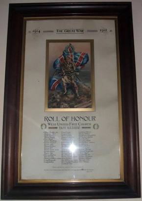 1914 THE GREAT WAR 1918/ROLL OF HONOUR/WEST UNITED FREE CHURCH/EAST KILBRIDE/[names in 3 columns] /Names marked * made the Supreme Sacrifice/Greater love hath no man than this, that a man lay down his life for his friends./John 15.13