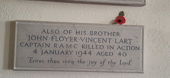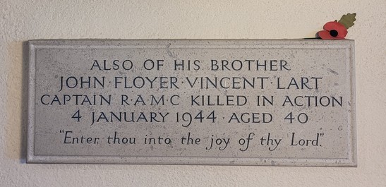 IN DEAREST MEMORY OF WING COMMANDER EDWARD COLLIS DE VIRAC LART D.S.O. R.A.F. KILLED IN ACTION AT DAWN 13 AUG 1940. AGED 38 . "HEAVENS MORNING BREAKS AND EARTHS VAIN SHADOWS FLEE". ALSO HIS BROTHER JOHN FLOYER VINCENT LART CPT. R.A.M.C. KILLED IN ACTION 4. JAN 1944 AGED 40. "ENTER THOU INTO THE JOY OF THY LORD" (EXACT LINE SPACING UNKNOWN)