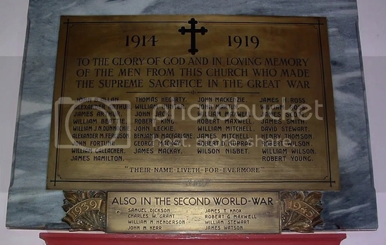 WW1- Column 1- ALLAN, John B./ ARTHUR, Alexander/ ARTHUR, James/ BEATTIE, William/ DUNNACHIE, William J. N./ FERGUSON, Alexander M./ FORTUNE, John/ GALLACHER, William/ HAMILTON, James; Column 2- HEGARTY, Thomas/ HUNTER, William/ JACK, John/ KING, Robert/ LECKIE, John/ MACFARLANE, Benjamin/ MACKAY, George/ MACKAY, James; Column 3- MACKENZIE, John/ MARTIN, John/ MAXWELL, William/ MAXWELL, Robert/ MITCHELL, William/ MURRAY, Robert D./ NISBET, Wilson; Column 4- ROSS, James H./ ROSS, William/ SCOTT, James/ SMITH, James/ STEWART, David/ THOMSON, Henry/ WILSON, Robert/ WILSON, William/ YOUNG, Robert; WW2- Column 1- DICKSON, Samuel/ GRANT, Charles W./ HENDERSON, William M./ KERR, John M.; Column 2- KNOX, James T./ MAXWELL, Robert G./ STEWART, William/ WATSON, James