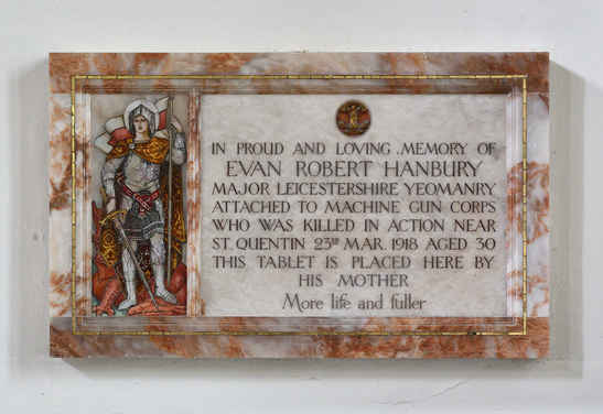 IN PROUD AND LOVING MEMORY OF / EVAN ROBERT HANBURY / MAJOR LEICESTERSHIRE YEOMANRY / ATTACHED TO MACHINE GUN CORPS / WHO WAS KILLED IN ACTION NEAR / ST. QUENTIN 23RD MAR. 1918 AGED 30 / THIS TABLET IS PLACED HERE BY / HIS MOTHER / More life and fuller