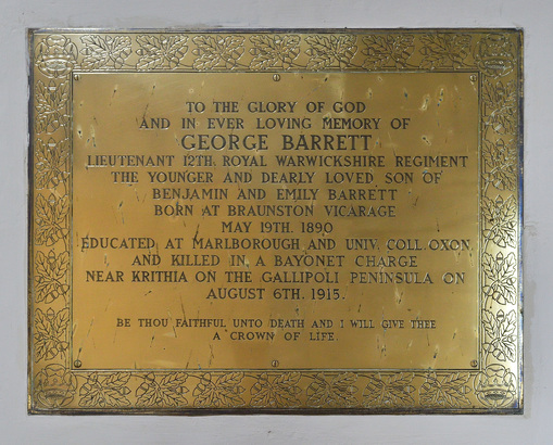 TO THE GLORY OF GOD / AND IN EVER LOVING MEMORY OF / GEORGE BARRETT / LIEUTENANT 12TH. ROYAL WARWICKSHIRE REGIMENT / THE YOUNGER AND DEARLY LOVED SON OF / BENJAMIN AND EMILY BARRETT / BORN AT BRAUNSTON VICARAGE / MAY 19TH. 1890 / EDUCATED AT MARLBOROUGH AND UNIV. COLL. OXON. / AND KILLED IN A BAYONET CHARGE / NEAR KRITHIA ON THE GALLIPOLI PENINSULA ON / AUGUST 6TH. 1915. / BE THOUGH FAITHFUL UNTO DEATH AND I WILL GIVE THEE / A CROWN OF LIFE.