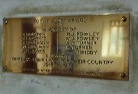 TO THE GLORY OF GOD/AND/IN MEMORY OF/[names in 2 columns]/WHO GAVE THEIR LIVES FOR THEIR COUNTRY/1914-1918/PRESENTED BY MR & MRS CRITCHLEY MARTIN
