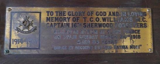 TO THE GLORY OF GOD AND IN LOVING/ MEMORY OF T.C.O. WILLIAMS M.C./ CAPTAIN 16TH SHERWOOD FORESTERS/ KILLED IN ACTION AT CLERY FRANCE/ ON PALM SUNDAY MARCH 24TH 1918/ AGED 34 YEARS/ "DULCE ET DECORUM EST PRO PATRIA MORI"