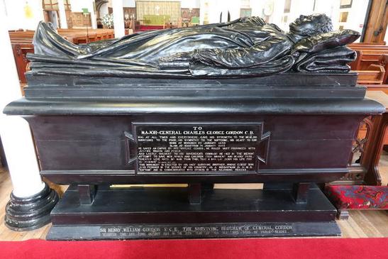 On sarcophagus panel: TO / MAJOR-GENERAL CHARLES GEORGE GORDON, C.B./ WHO AT ALL TIMES AND EVERYWHERE, GAVE HIS STRENGTH TO THE WEAK, HIS / SUBSTANCE TO THE POOR, HIS SYMPATHY TO THE SUFFERING, HIS HEART TO GOD. / BORN AT WOOLWICH 23 JANUARY 1833./ SLAIN AT KHARTOUM 26 JANUARY 1885. / HE SAVED AN EMPIRE BY HIS WARLIKE GENIUS, HE RULED VAST PROVINCES WITH / JUSTICE, WISDOM AND POWER. / AND LASTLY OBEDIENT TO HIS SOVEREIGN’S COMMAND HE DIED IN THE HEROIC / ATTEMPT TO SAVE MEN, WOMEN AND CHILDREN FROM IMMINENT AND DEADLY PERIL. / "GREATER LOVE HATH NO MAN THAN THIS; THAT A MAN MAY LAY DOWN HIS LIFE FOR / HIS FRIENDS" (S. JOHN, XV.13.) // THIS MONUMENT IS ERECTED BY HIS ONLY SURVIVING BROTHER, WHOSE ELDEST SON / ALSO PERISHED IN THE SERVICE OF HIS COUNTRY, AS A MIDSHIPMAN IN H.M.S. / "CAPTAIN" AND IS COMMEMORATED WITH OTHERS IN THE ADJOINING RECESS. On pedestal: SIR HENRY WILLIAM GORDON K C B. THE SURVIVING BROTHER OF GENERAL GORDON / DEPARTED THIS LIFE 22ND OCTOBER 1887. IN THE 70TH YEAR OF HIS AGE AND 53RD OF PUBLIC SERVICE.