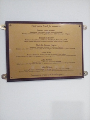 Samuel James Acland/Signalman at Truro, Lance Corporal, North Devon Hussars/Killed in action 2nd November 1915 aged 24. Buried at Hill 10 Cemetery in Gallipoli; Frederick Bailey/Packer at Liskeard, Gunner 'D' Battery 296th Brigade, Royal Field Artillery/Died of wounds 18th March 1918 aged 19. Buried at Achiet-le-Grand Cemetery; Melville George Harris/Shedman at Moorswater. Rifleman 1/21st London Regiment./Killed in action 15th September 1916 aged 26. No known grave and commemorated at Thiepval Memorial; Frank Hoar/Packer at Menheniot. Private 1/5th Duke of Cornwall's Light Infantry./Killed in action 31st March 1918 age unknown. No known grave and commemorated at Pozieres Memorial; John Jordan/Porter at Liskeard. Rifleman 21st London Regiment./Killed in action 12th September 1916 aged 21. No known grave and commemorated at Thiepval Memorial; John Wilton/Leading Packer at Liskeard. Gunner 327th Siege Battery, Royal Garrison Artillery./Killed in action 2nd June 1918 aged 40. Buried at Warloy Baillon Communal Cemetery Extension