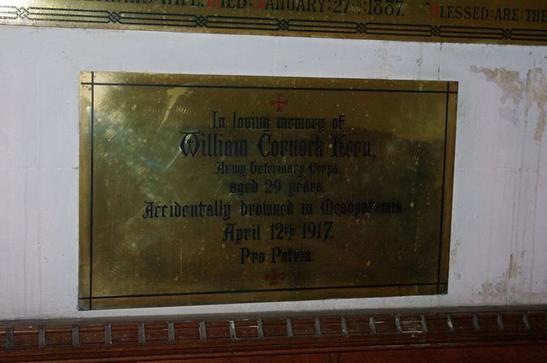 IN LOVING MEMORY OF / WILLIAM CORNOCK KEEN / ARMY VETERINARY CORPS / AGED 29 YEARS / ACCIDENTLY DROWNED IN MESOPOTAMIA / APRIL 12TH 1917 / PRO PATRIA / +