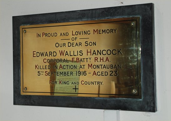 In proud and loving memory/of/our Dear Son/Edward Wallis Hancock/Corporal F Batty RHA/Killed in action at Montauban/5th September 1916 aged 23/for King and Country