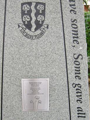 Stone: Lest we forget/ All gave some, Some gave all Plaque: Through marshes and bog,/ Through thunder and fog,/ What you did give,/ So we could live,/ What you have seen,/ Where you have been,/ Until we too,/ Aren't here at all,/ And only the poppies mark your fall.