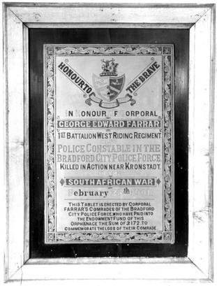 HONOUR TO THE BRAVE/ IN HONOUR OF CORPORAL/ GEORGE EDWARD FARRAR/ 1ST BATTALION WEST RIDING REGIMENT,/ ALSO/ POLICE CONSTABLE IN THE/ BRADFORD CITY POLICE FORCE,/ KILLED IN ACTION NEAR KRONSTADT,/ IN THE/ SOUTH AFRICAN WAR/ FEBRUARY 25TH 1901./ THIS TABLET IS ERECTED BY CORPORAL/ FARRAR'S COMRADES OF THE BRADFORD/ CITY POLICE FORCE, WHO HAVE PAID INTO/ THE ENDOWMENT FUND OF THIS/ ORPHANAGE THE SUM OF £172, TO/ COMMEMORATE THE LOSS OF THEIR COMRADE.