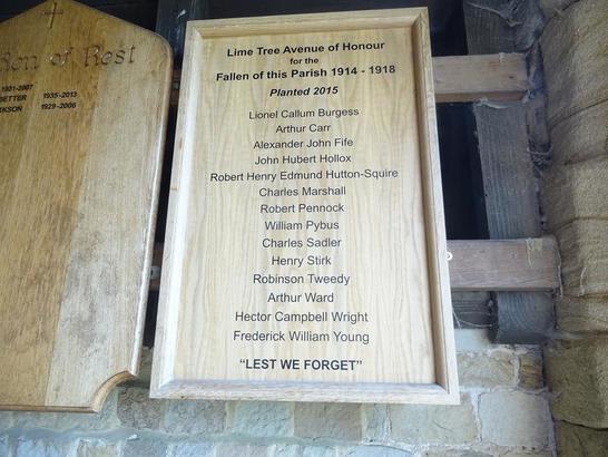 Lime Tree Avenue of Honour/for the/Fallen of this parish 1914-1918/planted 2015/names/"lest we forget"