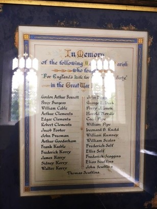 In Memory/of the following Men of this Parish/who fought/"For England's Life for England's Liberty"/in the Great War 1914/1918/(Names)//