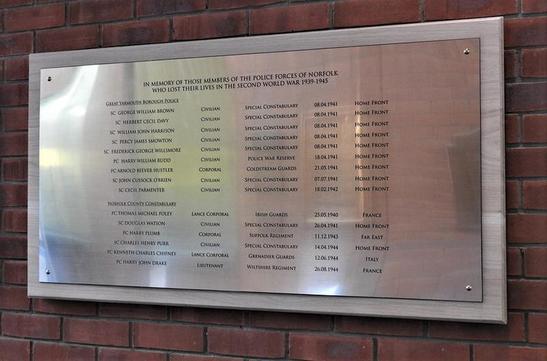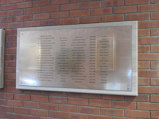 Plaque 1 reads: IN MEMORY OF THOSE MEMBERS OF THE POLICE FORCES OF NORFOLK/ WHO LOST THEIR LIVES IN THE SECOND WORLD WAR 1939-1945/ GREAT YARMOUTH BOROUGH POLICE/ (NAMES)/ NORFOLK COUNTY CONSTABULARY/ (NAMES) Continuation Plaque 2 reads: NORWICH CITY POLICE/ (NAMES)