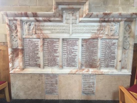TO THE GLORY OF GOD AND IN PROUD AND HONOURED REMEMBRANCE OF THE MEN/ FROM THIS PARISH WHO GAVE THEIR LIVES IN THE GREAT WAR 1914 - 1919/ (Names)/ 1939 - 45/ (Names)