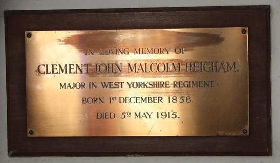 IN LOVING MEMORY OF/CLEMENT JOHN MALCOLM HEIGHAM/MAJOR IN WEST YORKSHIRE REGIMENT/BORN 1ST DECEMBER 1858/Died 5TH MAY 1915.//