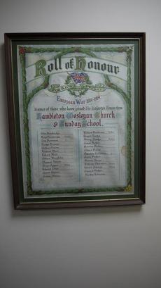 Roll of Honour/ FOR KING AND COUNTRY/ European War 1914 - 1919./ Names of those who have joined His Majesty's Forces from/ Hambleton Wesleyan Church/ & Sunday School/ (Names)