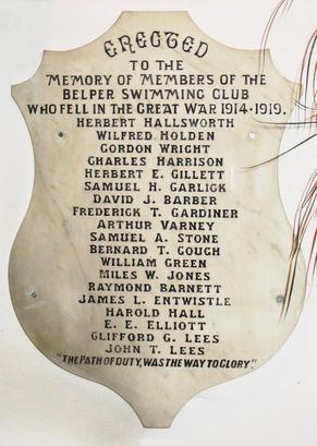 ERECTED/ TO THE/ MEMORY OF MEMBERS OF THE/ BELPER SWIMMING CLUB/ WHO FELL IN THE GREAT WAR 1914-1919./[names]/"THE PATH OF DUTY, WAS THE WAY TO GLORY."
