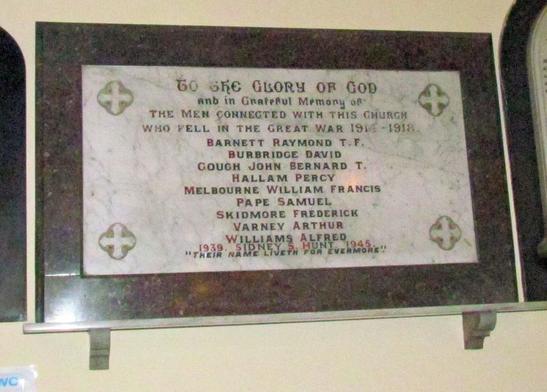 WW1- BARNETT RAYMOND T F/ BURRIDGE DAVID/ GOUGH JOHN BERNARD T/ HALLAM PERCY/ MELBOURNE WILLIAM FRANCIS/ PAPE SAMUEL/ SKIDMORE FREDERICK/ VARNEY ARTHUR/ WILLIAMS ALFRED; WW2-SIDNEY S HUNT