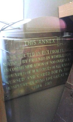 THIS ANNEX/WAS ERECTED IN 1921 FROM FUNDS/RAISED BY FRIENDS IN WIMBLEDON/IN COMMEMORATION OF 500 OVERSEAS/WOUNDED OF H.M. FORCES OF ALL RANKS/NURSED AND CARED FOR IN THE/HOSPITAL DURING THE GREAT WAR/1914-1919