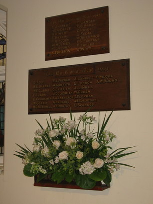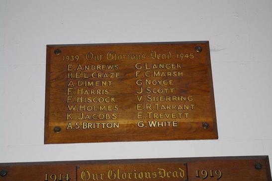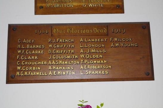 Second World War names: E. Andrews; H.E.L. Craze; A. Diment; F. Harris; F. Hiscock; W. Holmes; K. Jacobs; A.S. Britton; G. Langer; F.C. Marsh; G. Noyce; J. Scott; V. Sherring; E.R. Tarrant; E. Trevett; G. White. First World War names: G. Adey; H.L. Barnes; W.F. Clarke; F. Clark; C. Croucher; W. Corbin; H.G.H. Farwell; P.J. French; W. Griffith; D. Griffith; J. Goldsmith; A.A.S. Hamilton; A. Hawkins; A.E. Hinton; A. Lambert; L. London; A. J. Mills; W. Olden; T. Plowman; A.E. Robertson; L. Sparkes; F. Wilcox; A.W. Young.