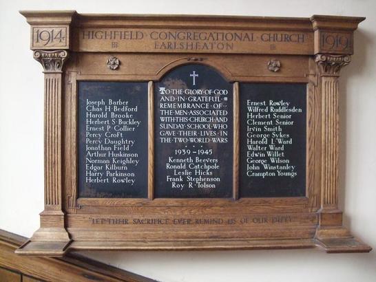 1914 - 1919/ HIGHFIELD CONGREGATIONAL CHURCH/ EARLSHEATON/ TO THE GLORY OF GOD/ AND IN GRATEFUL/ REMEMBRANCE OF/ THE MEN ASSOCIATED/ WITH THIS CHURCH AND/ SUNDAY SCHOOL WHO/ GAVE THEIR LIVES IN/ THE TWO WORLD WARS/ (Names)